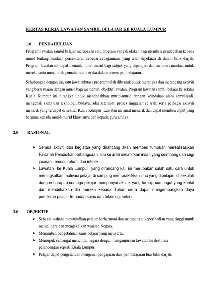 Menara kuala lumpur telah direka bentuk oleh kumpulan senireka sdn. Sekolah kebangsaan sena mengucapkan terima kasih kepada pihak semua yang telah terlibat menjayakan lawatan ini. Kertas kerja lawatan ke kuala lumpur 2013. Taman botani kuala lumpur bagi mereka yang gemar fotografi, taman rekreasi ni boleh di jadikan lokasi lawatan anda. Pusat dagangan dunia putra (pwtc), 41, jalan tun ismail 50480, kuala lumpur, malaysia tarikh: